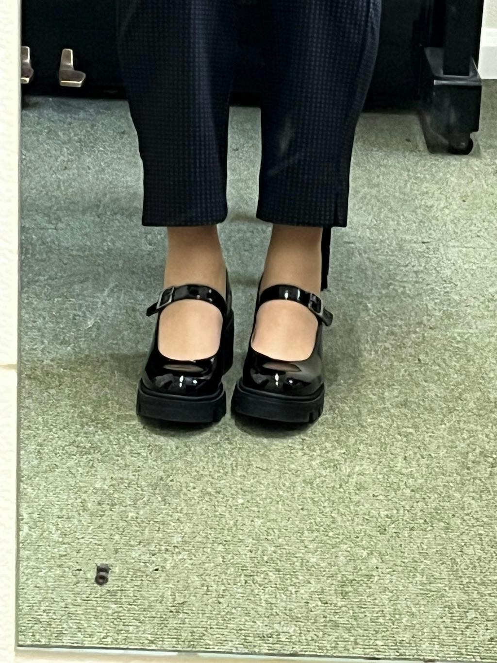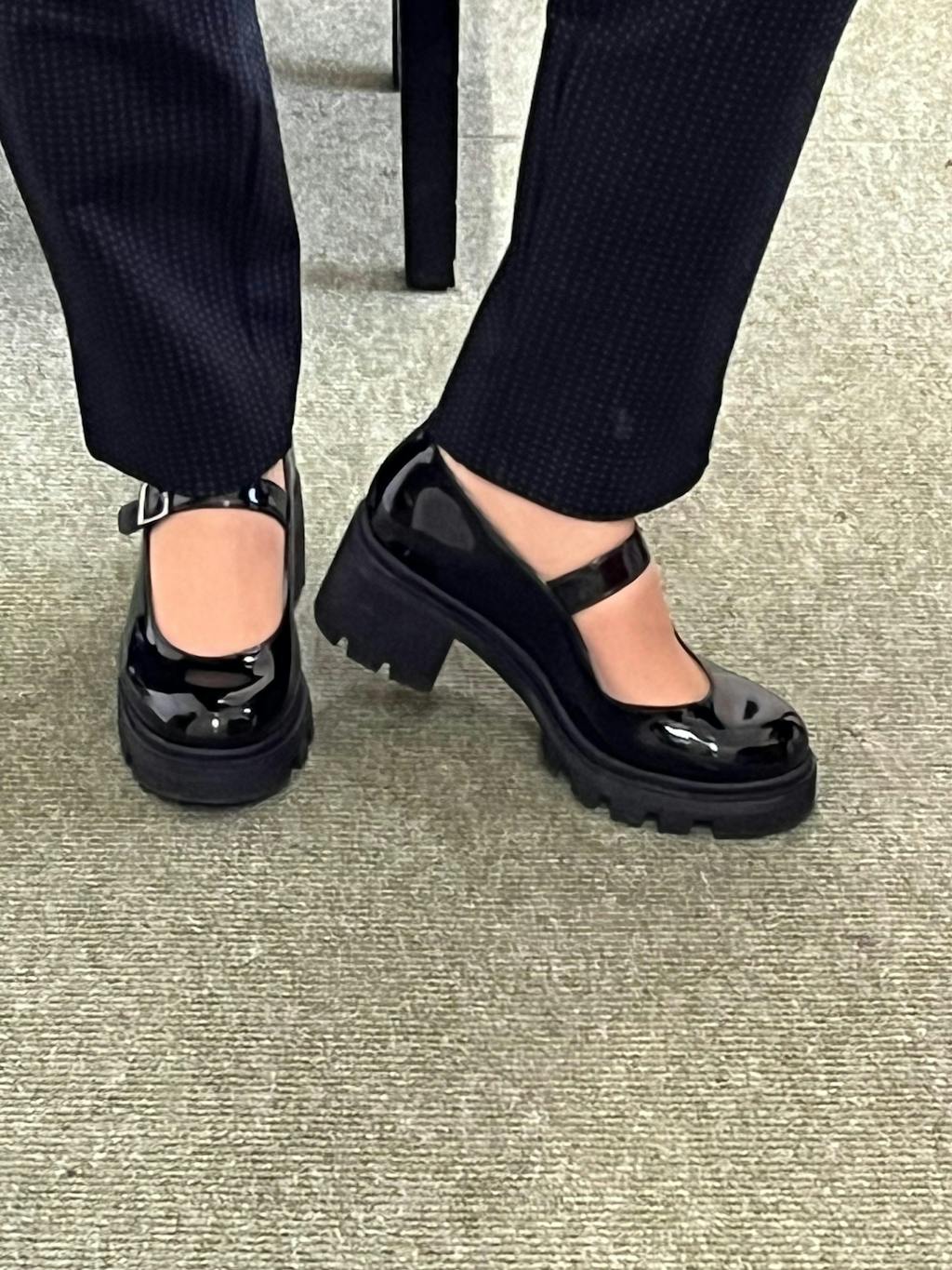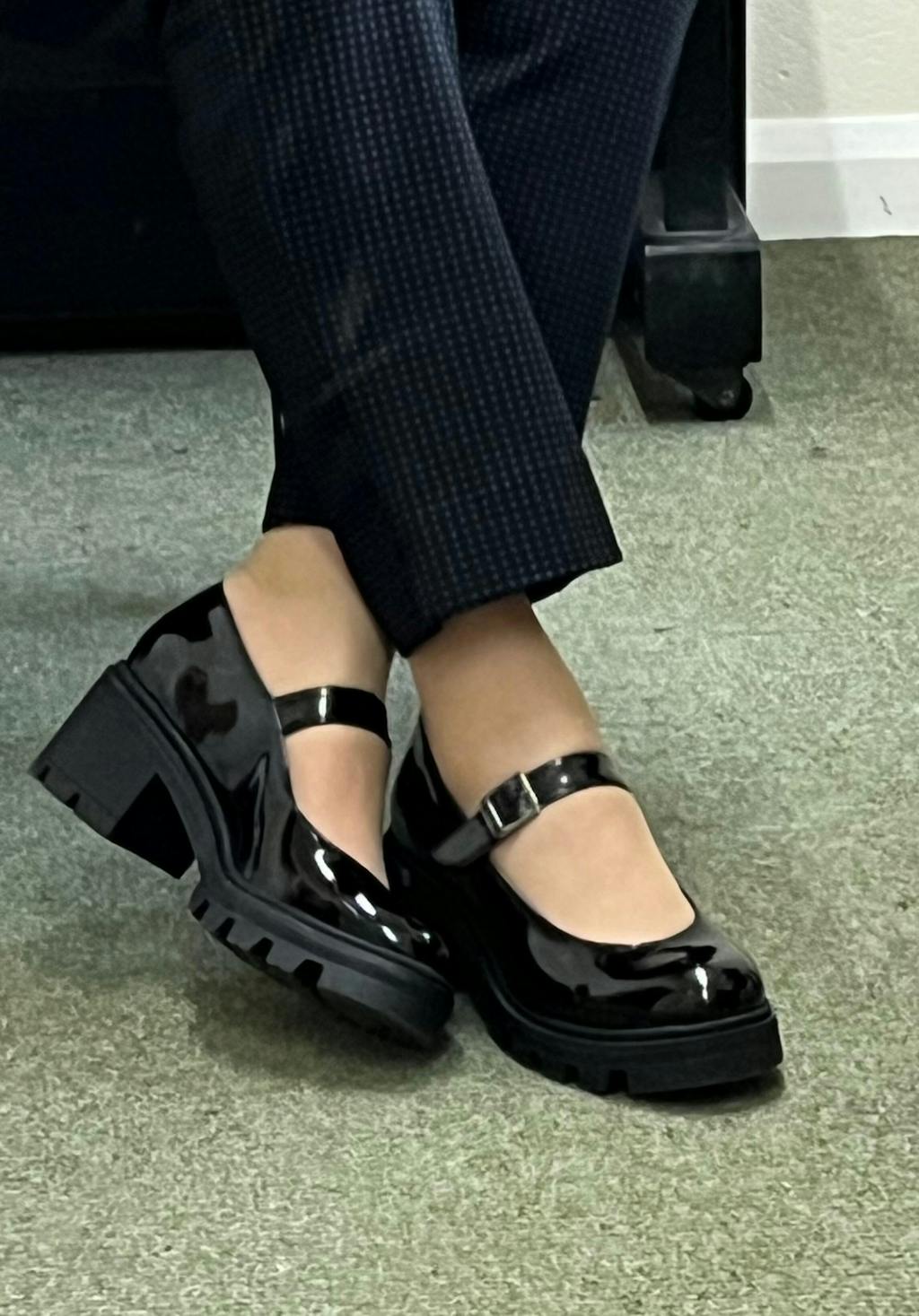 - Timeless patent black Mary Jane uppers meet contemporary chunky track soles, creating a striking silhouette.