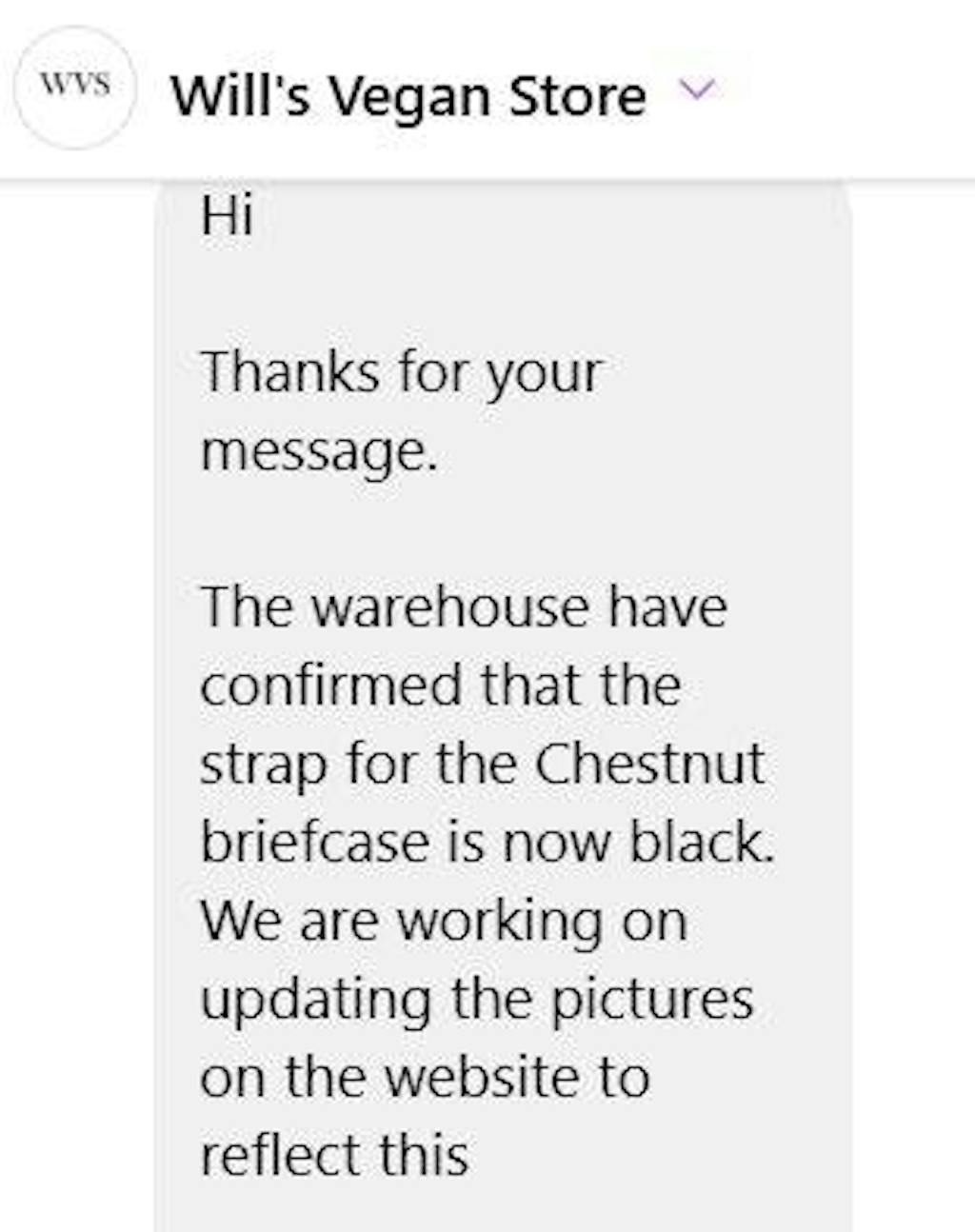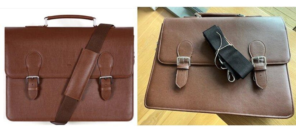 The images include one of the many excuses sent, the black strap with the case, and a close up of the straps for the black and chestnut briefcase next to one another - sent to WVS after they said they were the same colour.